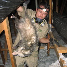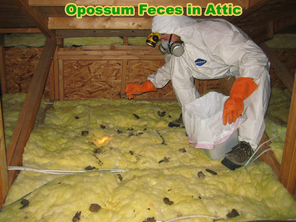 Here is a photo of the type of mess a possum can leave when they live in your attic. They can fill the insulation with possum feces. These feces are best removed by hand, with proper protection. Prevent this from happening by removing opossums from the attic